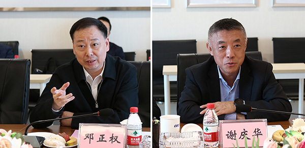 遂寧市市長鄧正權、中電科技董事長謝慶華在座談會上探討交流